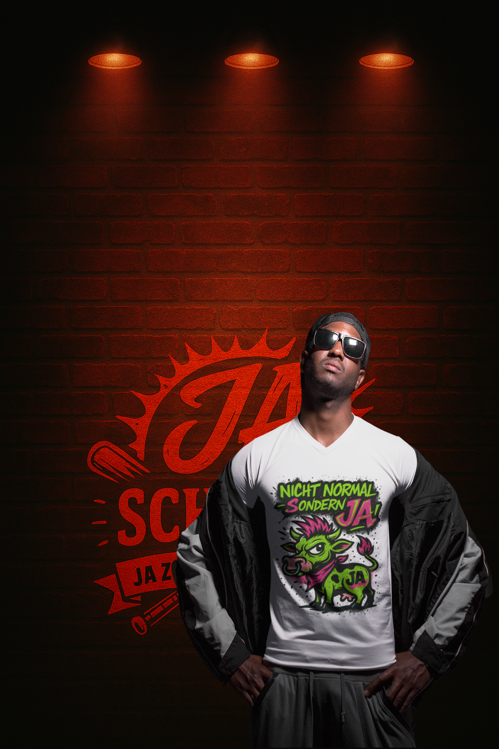 - Design: Neon-Punk-Kuh mit Nase Ring, Spritzer-Background & JA-Schriftzug.